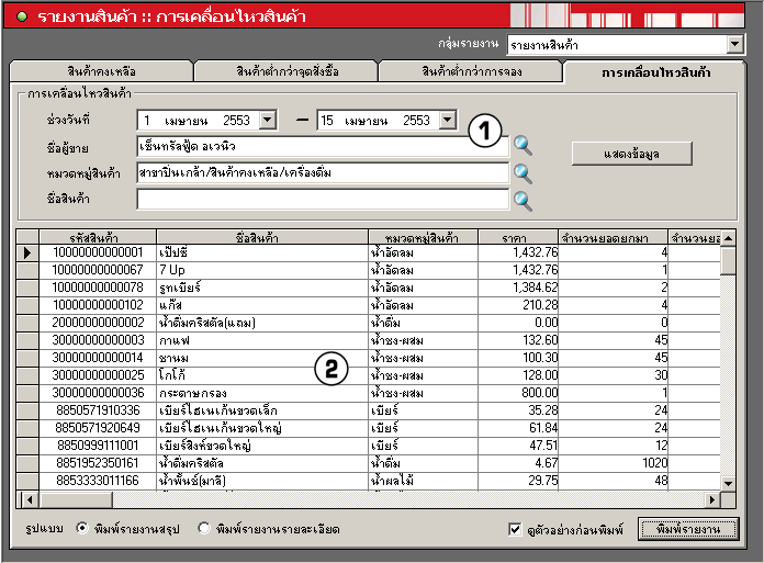 หลังจากที่พนักงานที่เกี่ยวข้องทำการเบิก-จ่ายสต๊อกจากหน้าจอทำงานแล้ว(ตัวอย่างที่ 1,2) ผู้จัดการสามารถเรียกดูรายงานการเคลื่อนไหวสินค้า ซึ่งเป็นรายงานที่ทำเพิ่มใหม่ตามรูปแบบความต้องการของลูกค้า โดยกำหนดเงื่อนไขรายงาน โปรแกรมจะแสดงรายละเอียด ดังรูป