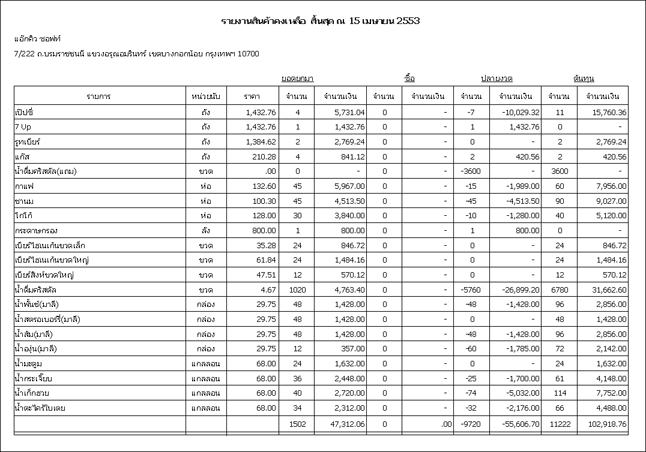 หน้าจอตัวอย่าง รายงานเคลื่อนไหวสต๊อกแบบสรุป (เพิ่มเติมใหม่)